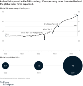 Geçtiğimiz yüzyıl boyunca, iyileştirilmiş hijyen, daha iyi beslenme, antibiyotikler, aşılar ve yeni teknolojiler küresel sağlıkta muazzam ilerlemelere katkıda bulunmuştur. Son inovasyonlar, birçok ülkede belirli kanser türleri, kalp hastalıkları ve felç geçiren kişiler için hayatta kalma oranlarında çarpıcı iyileşmelere yol açmıştır. Sağlıktaki iyileşmeler yaşamları uzatmış ve yaşam kalitesini iyileştirmiş, 20. yüzyılın ikinci yarısında iş gücünün ve iş gücü verimliliğinin hızla genişlemesine katkıda bulunarak o dönemdeki güçlü ekonomik büyümenin arkasındaki temel faktörler olmuştur. Ülkeler zenginleştikçe daha iyi gıdaya ve daha güvenli ortamlara yatırım yapmış, bu da iyileşen sağlık ve daha yüksek gelirlerden oluşan erdemli bir döngü yaratmıştır. Ekonomistler, geçtiğimiz yüzyılda gelişmiş ekonomilerdeki ekonomik büyümenin yaklaşık üçte birinin küresel nüfusların sağlığındaki iyileşmelere atfedilebileceğini tahmin etmektedir. Daha yakın yıllara odaklanan araştırmalar, sağlığın gelir artışına neredeyse eğitim kadar katkıda bulunduğunu ortaya koymuştur.