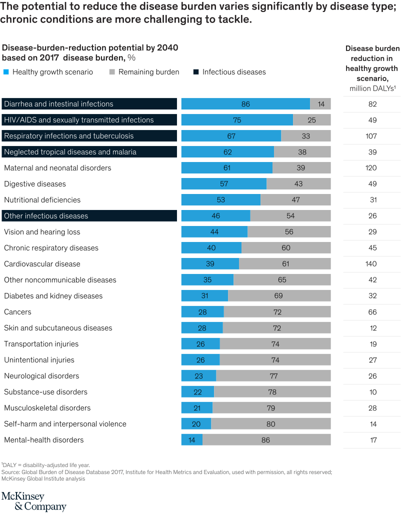 Küresel hastalık yükünde bu büyüklükte bir azalma önemli sağlık faydaları sağlayacaktır. Çocuk ölümleri 2040 yılına kadar yüzde 65 oranında düşebilir. Kanser ölümleri yüzde 29, kardiyovasküler hastalık ölümleri yüzde 39 ve ihmal edilen tropikal hastalıklar ve sıtma ölümleri yüzde 62 oranında azalabilir. Genel olarak, 2040 yılında 230 milyon daha fazla insan hayatta olabilir ve bunların yarısı 70 yaşın altında olabilir. Orta yaşlı insanlar için bu değişim, sağlıklı geçirilen yıl sayısını on yıl uzatabilir, esasen 65 yaşı yeni 55 yaş yapabilir. Dünyadaki her bölge bu aralıkta bir iyileşme yaşayacaktır.